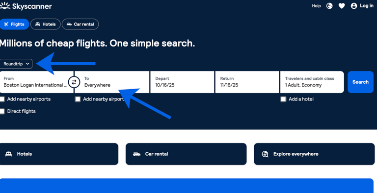 Second step type in round trip and explore into the search bar of skyscanner once in the platform.
